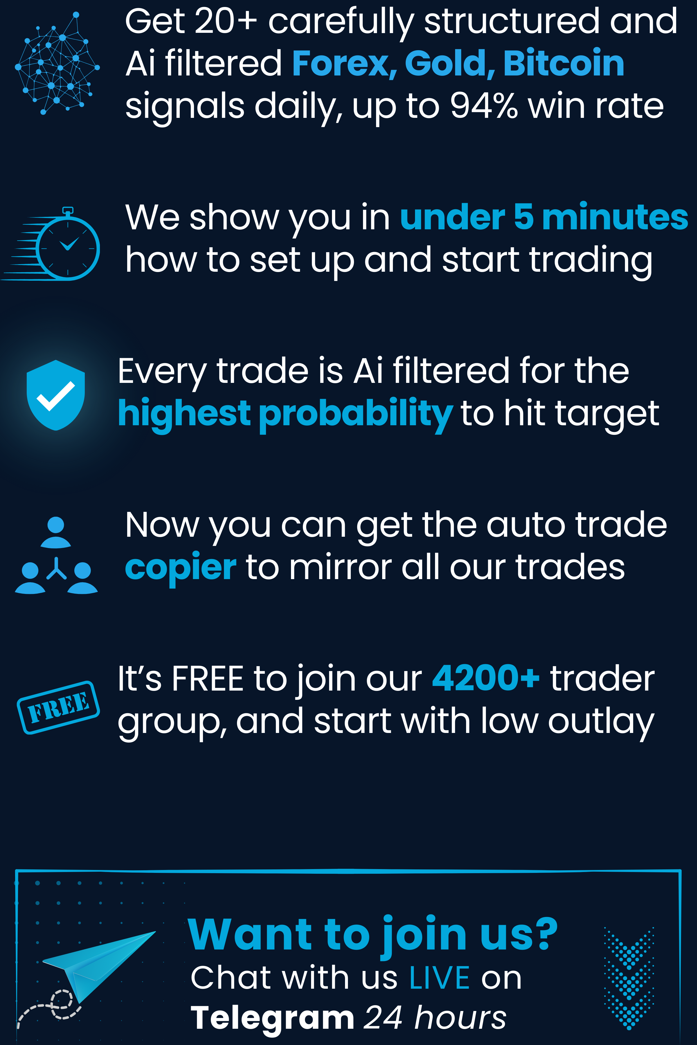 We have taken Ai trading integration to a groundbreaking new level, by using 7 interconnected bots powered by our bespoke cutting edge Ai technology. These bots collaboratively scan the market, searching for hundreds of parameters like particular candlestick patterns, bollinger band confluences, and support - resistance confirmations to identify optimal trade setups. Then it's manually approved by our team before being released to our VIP trading community.